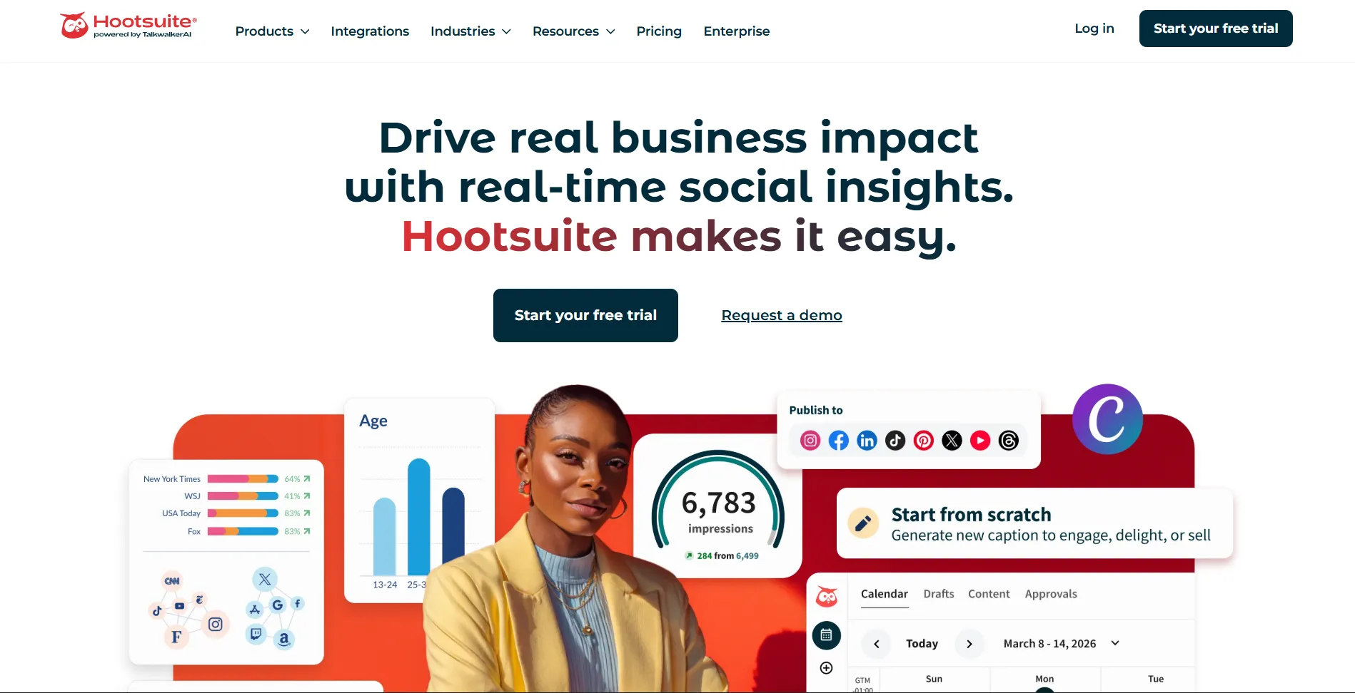 | Tool #6Hootsuite | Category: Social Media Scheduling, Monitoring & ReportingBest For: Social media managers, agencies, multi-brand companiesPricing: Professional from $99/month. Team from $249/month.Rating: 4.1/5 on G2 (4,000+ reviews) |