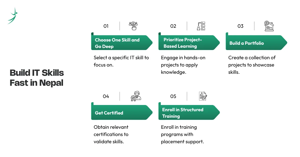 Knowing which IT skills are in demand is step one. Building them effectively, without wasting months on the wrong approach, is what actually gets you hired. Here is the most direct, practical path to building job-ready IT skills in Nepal in 2026.