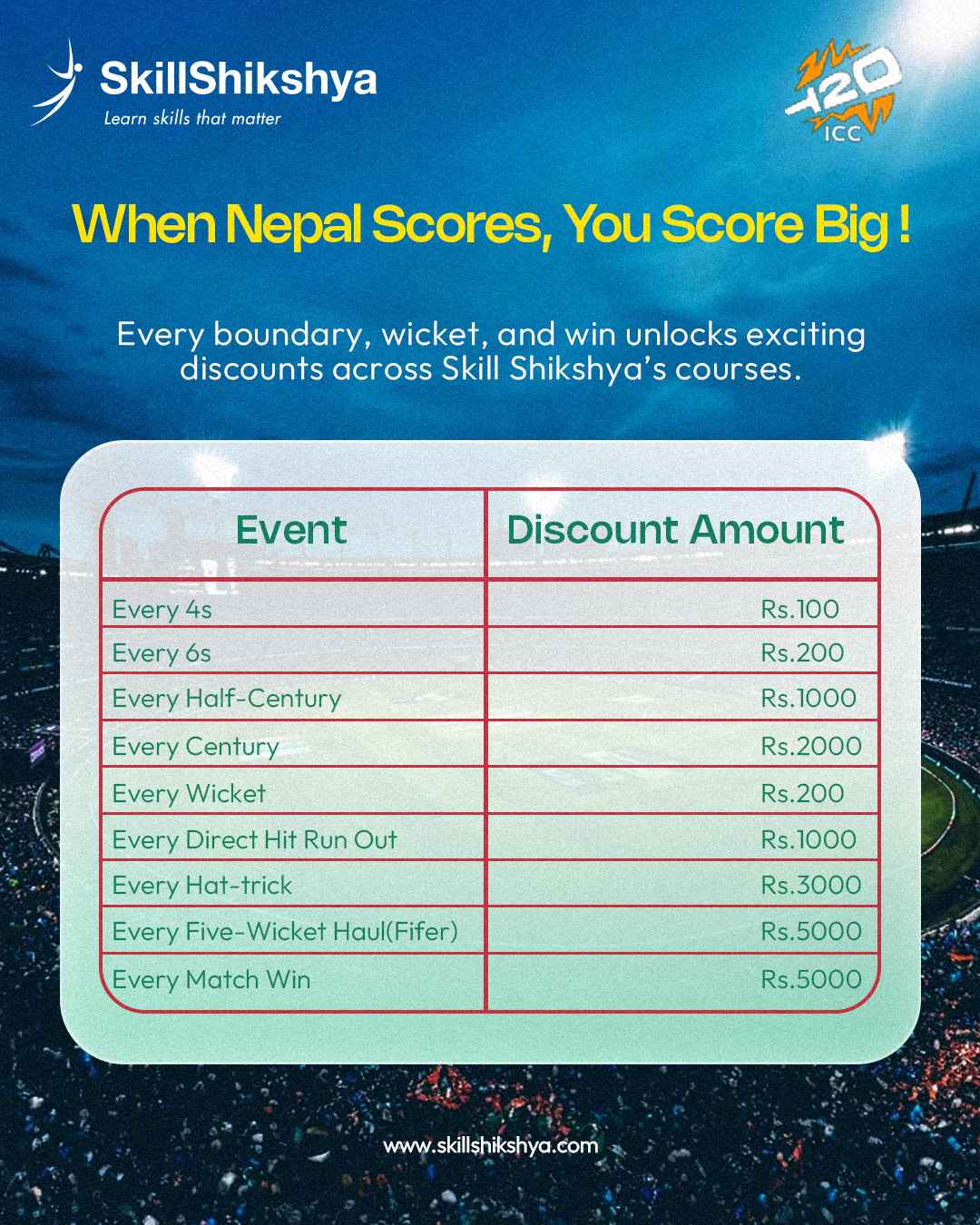 Celebrate the Cricket World Cup with exclusive course discounts based on Nepal’s performance! The better Nepal plays, the bigger your discount. Enroll now and save big during this limited-time event!